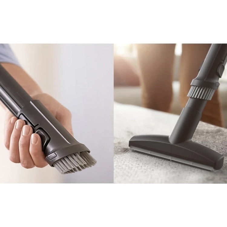 | سایر توضیحات | جاروبرقی دارای سیستم کنترل مکانیکی بر روی بدنه دستگاه / دارای دریچه ایمنی کیسه / قابلیت چرخش 360 درجه لوله خرطومی / جنس بدنه از پلاستیک فشرده / لوله تلسکوپی فلزی 2 قسمتی / نازل اصلی مدل +TriActive با قابلیت تنظیم در 2 حالت برای تمیز کردن سطوح صاف و کف زمین / مجهز به نازل سوپر پارکت برای از بین بردن 3 برابر بیشتر کثیفی های چسپنده / فناوری Airflow Max برای به حداکثر رساندن جریان هوا و بالاترین قدرت مکش حتی با پر شدن کیسه / قابلیت تنظیم قدرت مکش به کمک دکمه چرخشی روی بدنه / دارای کنترل از راه دور بدون خم شدن، با فناوری بی سیم IR |