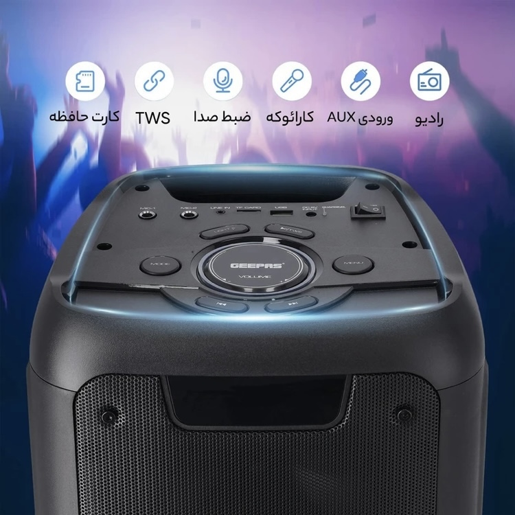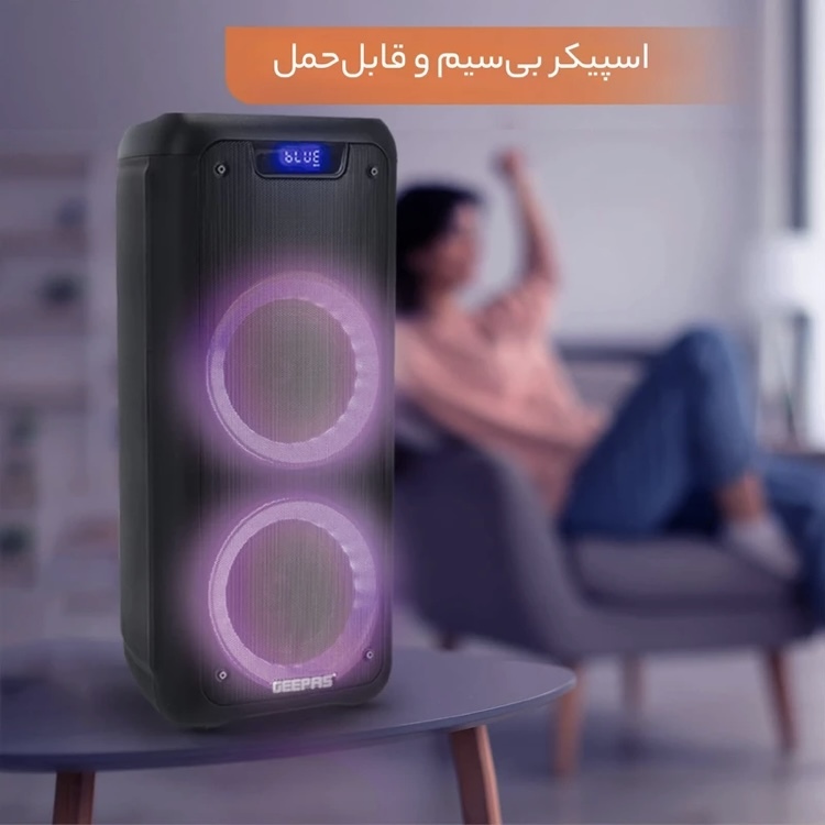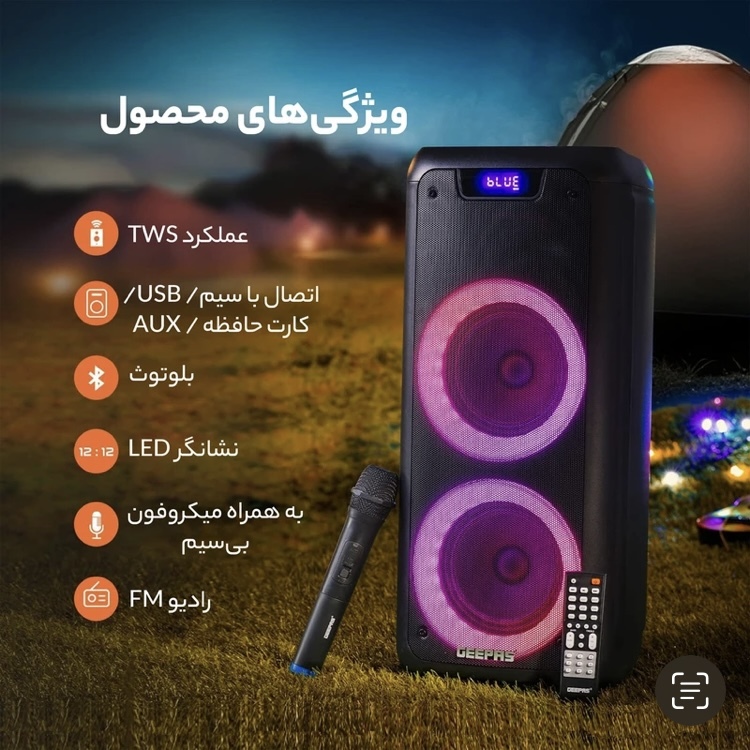 اسپیکر بلوتوثی جی پاس مدل GMS11168 یکی از اسپیکرهای پرطرفدار با توجه به قیمت و کیفیت بالای سخت محسوب میشه این اسپیکر با توجه به قابلیت های زیادی که داره شما رو به هرپخش کننده سیستمی بی نیاز میکنه از ویژگی های خوب اسپیکر جی پاس قابلیت TWSبرای اتصال همزمان دو اسپیکر به همدیگه ، دارای رادیو با کیفیت بالا بدون قطعی و اتصالی ،کنترل از راه دور برای پخش و تنظیمات اسپیکر ، میکروفون وایرلس و قابلیت کارائوکه ، منوی تنظیمات Treble/Bass/Echo/ Mic ، دارای رقص نورهای متنوع و 7 رنگ جذاب ، اتصال دو میکروفون به اسپیکر ، برنامه اختصاصی قابل دانلود بر روی اندروید و ios ، اتصال AUX ، ورودی های رم و فلش و... تنها بخشی از قابلیت های این اسپیکر از برند محبوب جی پاس رو شامل میشه